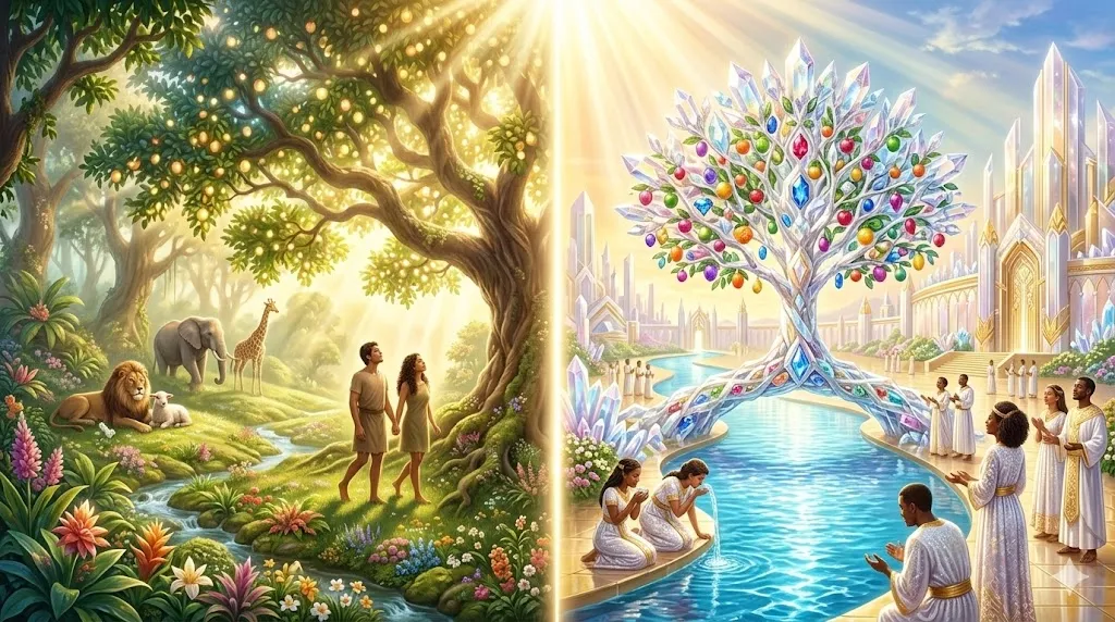 말씀을 듣는 여러분, 거듭난 자의 시선은 이제 땅을 향하지 않습니다. 우리의 시선은 성경의 마지막 장, 하늘에서 내려오는 거룩한 도시 **'새 예루살렘(New Jerusalem)'**에 고정됩니다. 그곳에 드디어, 창세기에서 잃어버렸던 그 나무가 완벽하게 회복되어 나타납니다.