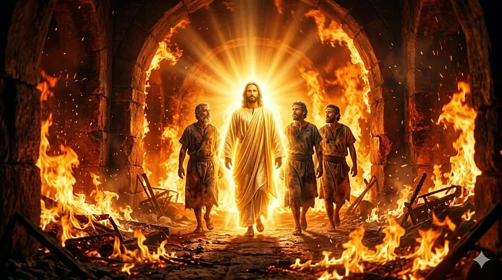 우상에게 절하지 않은 사드락, 메삭, 아벳느고가 일곱 배나 뜨거운 용광로 속에 던져졌을 때, 불 속을 걷는 자가 세 명이 아니라 '네 명'이었습니다!