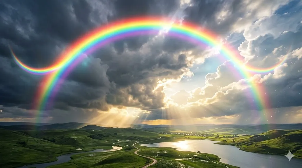 성경적 적용 (신약 구절): 이 무지개는 "다시는 물로 세상을 멸하지 않겠다"는 은혜의 선언이자, 훗날 인류의 죄에 대한 진노의 화살을 당신의 독생자 예수 그리스도께(하늘을 향해) 쏘시겠다는 십자가 대속의 위대한 그림자입니다. 요한계시록 4장 3절에는 영광스러운 하나님의 왕좌를 빙 둘러싼 무지개가 등장합니다. 이것은 끝없는 하나님의 자비와 긍휼을 상징합니다!
