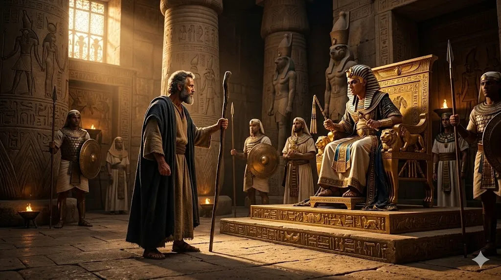 "주(LORD)가 누구이기에 내가 순종하겠느냐?" 하나님의 절대 주권과 세상의 교만이 정면으로 충돌하는 파라오의 왕좌. 이는 진리의 말씀이 선포될 때 세상이 보이는 필연적인 거부 반응을 상징합니다.