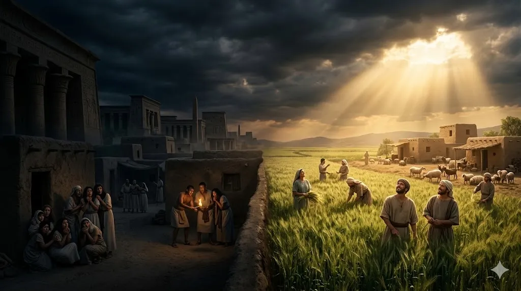(개역개정) ...온 이스라엘 자손들이 거주하는 곳에는 빛이 있었더라 | [보존된 진리] 요한계시록 21장에서 새 예루살렘에는 해나 달이 필요 없고 "어린양께서 그 도시의 빛"이 되십니다. 온 세상이 흑암(짐승의 통치)에 덮일 때, 하나님의 백성이 머무는 곳에만 초자연적인 참된 빛(그리스도의 빛)이 임재함을 완벽하게 예표합니다. |