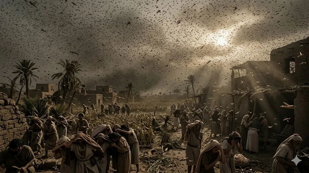 출애굽기 10장의 재앙들은 인간의 생존을 완전히 끝장내는 대환난 심판의 절정을 보여줍니다. 우박이 남겨둔 모든 채소와 열매를 '메뚜기 떼'가 모조리 먹어 치웠고, 뒤이어 더듬어 만질 수 있을 만큼 짙은 '흑암'이 3일 동안 이집트를 덮쳤습니다. 이 두 재앙은 요한계시록에서 적그리스도의 왕국에 쏟아질 대환난의 나팔 및 금병 심판과 정확하게 일치하는 소름 돋는 예표입니다!