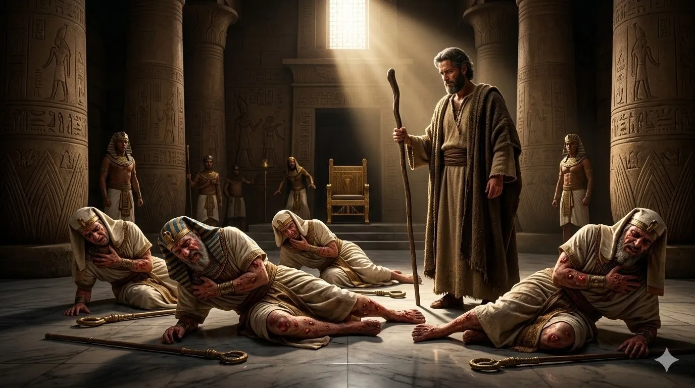 이집트의 마술사들은 7장과 8장까지만 해도 지팡이를 뱀으로 만들고 물을 피로 바꾸며 감히 하나님의 진리를 모방하고 대적했습니다. 그러나 9장에 이르러, 하나님께서 내리신 '악성 종기' 앞에서는 그들의 마술이 아무 소용이 없었고, 결국 자기 몸에 난 종기의 극심한 고통 때문에 모세(진리) 앞에 똑바로 일어서지도 못하고 쓰러져 버렸습니다.