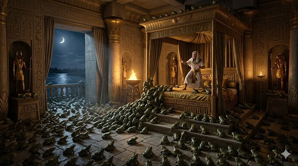이집트 온 땅에 시끄럽게 울어대며 징그럽게 기어오르던 개구리 떼는, 장차 온 세상의 왕들을 미혹하여 아마겟돈 전쟁으로 끌어모을 사탄과 적그리스도의 '거짓되고 더러운 영(말씀의 왜곡)'을 정확히 예표합니다. 파라오의 궁정(정치 권력)과 침실(은밀한 사생활)까지 파고든 이 개구리들은, 말세에 정치, 문화, 사상 등 인간 삶의 모든 영역을 잠식하는 마귀적인 미혹의 실체입니다.