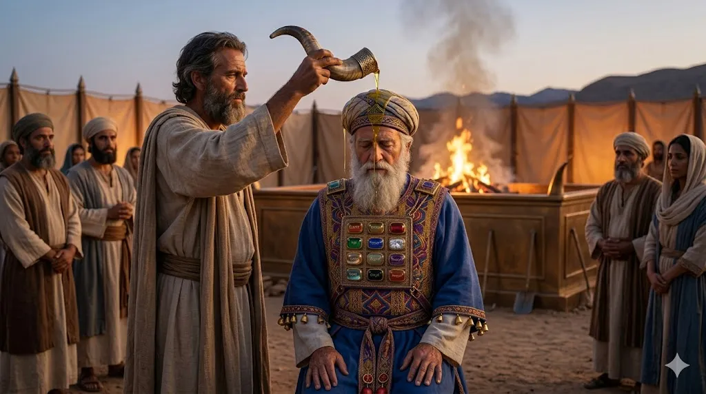대제사장 아론의 머리에 부어지는 거룩한 관유(기름). 하나님의 사역을 감당하기 위해서는 인간의 열심이나 능력이 아니라, 오직 위로부터 부어지는 '성령의 기름부음'이 절대적으로 필요함을 보여주는 장엄한 위임식의 시작입니다