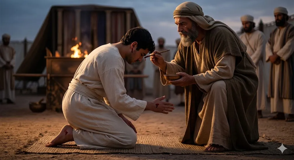 제사장의 오른쪽 귀끝, 엄지손가락, 엄지발가락에 피를 바르는 의식. 하나님의 음성을 듣는 귀, 하나님의 일을 하는 손, 하나님과 동행하는 발이 모두 그리스도의 보혈로 철저히 덮이고 성별되어야 함을 뜻합니다