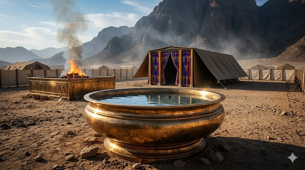 성막 뜰의 놋 제단과 성소 입구 사이에 놓인 '물두멍(Bronze Laver)'. 제사장들이 거룩한 성소에 들어가기 전 반드시 이곳에서 손발을 씻어야 했던 것처럼, 우리가 하나님과 교제하기 위해서는 매일 말씀의 물(Laver)로 우리의 삶과 행위를 철저히 씻고 정결하게 해야 함을 보여줍니다.