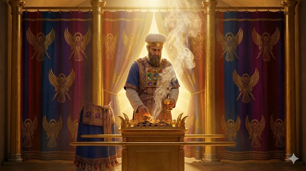 지성소 휘장 앞에서 금 등잔대의 따뜻한 빛 아래 분향 제단에 향을 피우는 대제사장 아론. 이 향기로운 향은 우리의 영원한 중보자이신 예수 그리스도의 이름으로 올려드리는 성도들의 끊임없는 **'기도(Prayer)'**가 하나님의 보좌에 흠향됨을 뜻합니다.