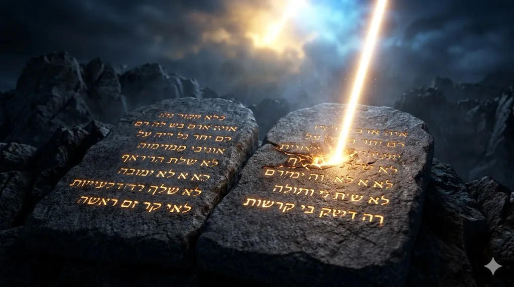 하나님의 손가락으로 친히 돌판에 새겨주신 두 개의 증언 판(십계명). 하나님의 말씀은 인간의 철학이나 모세의 개인적인 생각이 섞인 것이 아니라, 절대적인 신적 권위(하나님의 손가락)로 우리 영혼의 돌판에 영원히 지워지지 않도록 새겨진 불변의 진리입니다.