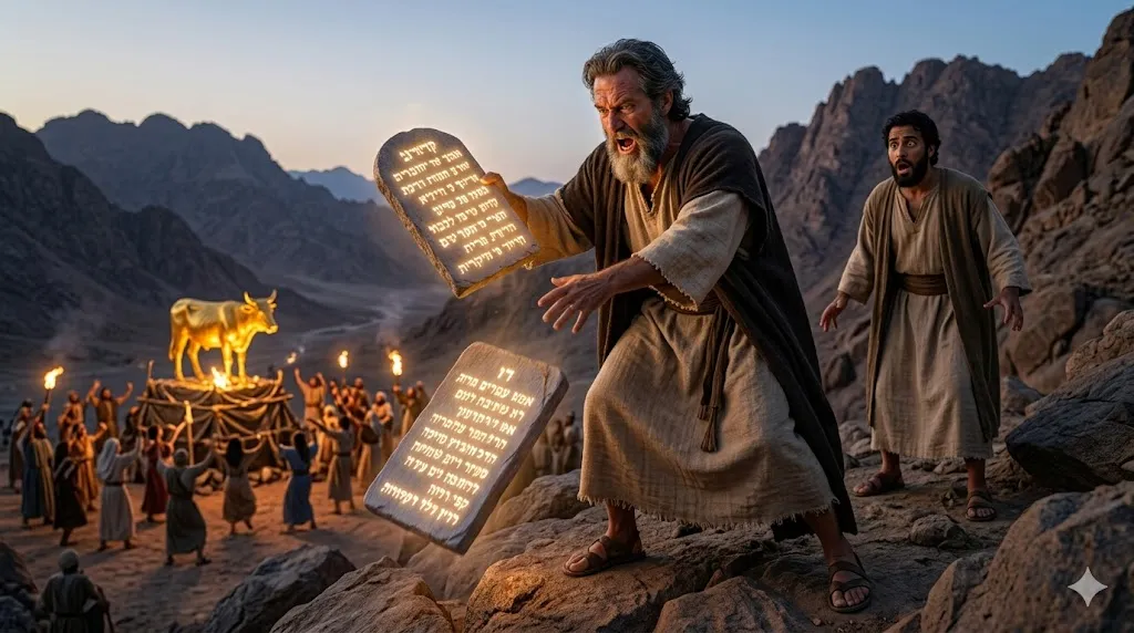 이스라엘 백성들의 우상숭배 현장을 보고 격노하여 하나님의 손가락으로 쓰인 두 돌판을 깨뜨려버리는 모세! 이것은 혈기가 아니라, 우상숭배로 인해 이스라엘과 하나님 사이의 '거룩한 언약(결혼 서약)'이 산산조각 났음을 보여주는 가장 충격적이고 예언적인 퍼포먼스입니다.