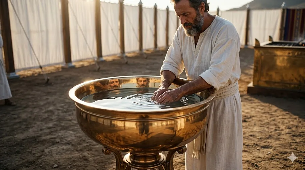 여인들이 바친 '거울'을 녹여 만든 놋 물두멍. 제사장들은 번제단을 통과한 후에도, 성소에 들어가기 전 반드시 이곳에서 손과 발을 씻어야 죽음을 면할 수 있었습니다. 구원받은 성도라도 매일매일 하나님의 말씀(거울) 앞에 자신을 비추어 보고 세상의 더러움을 씻어내는 성결(Sanctification)의 과정이 필수적입니다.