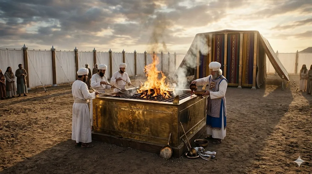 성막 뜰의 한가운데를 차지하고 있는 거대한 놋 번제단. 지성소의 금빛 영광으로 나아가기 위해서는 반드시 이 무시무시한 심판의 불길이 타오르는 제단(십자가)을 통과해야만 합니다. 피 흘림이 없이는 결코 죄 사함도, 하나님과의 교제도 불가능합니다.